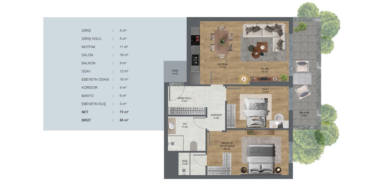 2 adet modern blok ve her katta 4 adet 2+1 daire (84 m²) ve 2 adet 1+1 daire (50 m²)